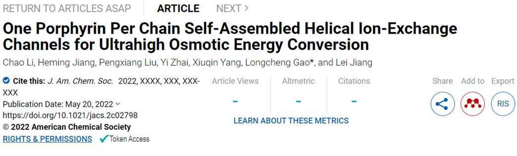 2022年5月20日,Journal of the American Chemical Society 在线发表了我院江雷院士、高龙成副教授团队在高效离子交换膜方面的最新研究成果:“One Porphyrin Per Chain Self-Assembled Helical Ion-Exchange Channels for Ultrahigh Osmotic Energy Conversion”。365(VIP)英国上市公司博士生李超为第一作者,高龙成副教授为通讯作者,北京航空航天大学365(VIP)英国上市公司为第一单位。