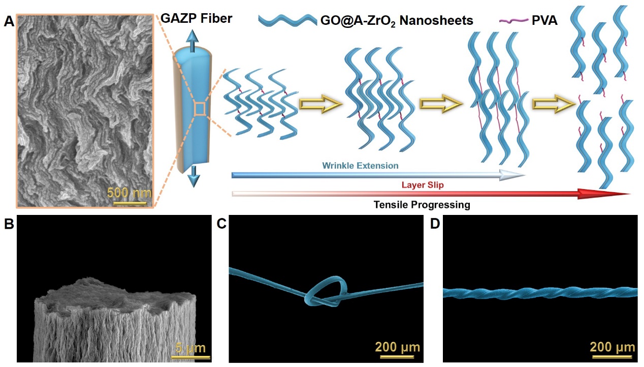 高性能纤维在航空航天、生物医学、建筑和纺织等领域都具有广泛的应用,激发了研究者极大的兴趣。氧化石墨烯(GO)是制造高性能碳基纤维材料的最佳选择材料之一。当前,超强氧化石墨烯基纤维(强度>800 MPa)主要以大尺寸氧化石墨烯(平均尺寸>20 µm)或者还原氧化石墨烯为原料进行制备,上述原料的制备通常需要高温热处理或者需使用有毒性的氢碘酸或水合肼,不仅对环境不友好,而且存在一定的操作危险。因此,发展新的高强纤维增强策略,开发经济、高效且环境友好的制备高性能纤维材料的方法是当前高性能纤维研究领域的热点和难点问题。