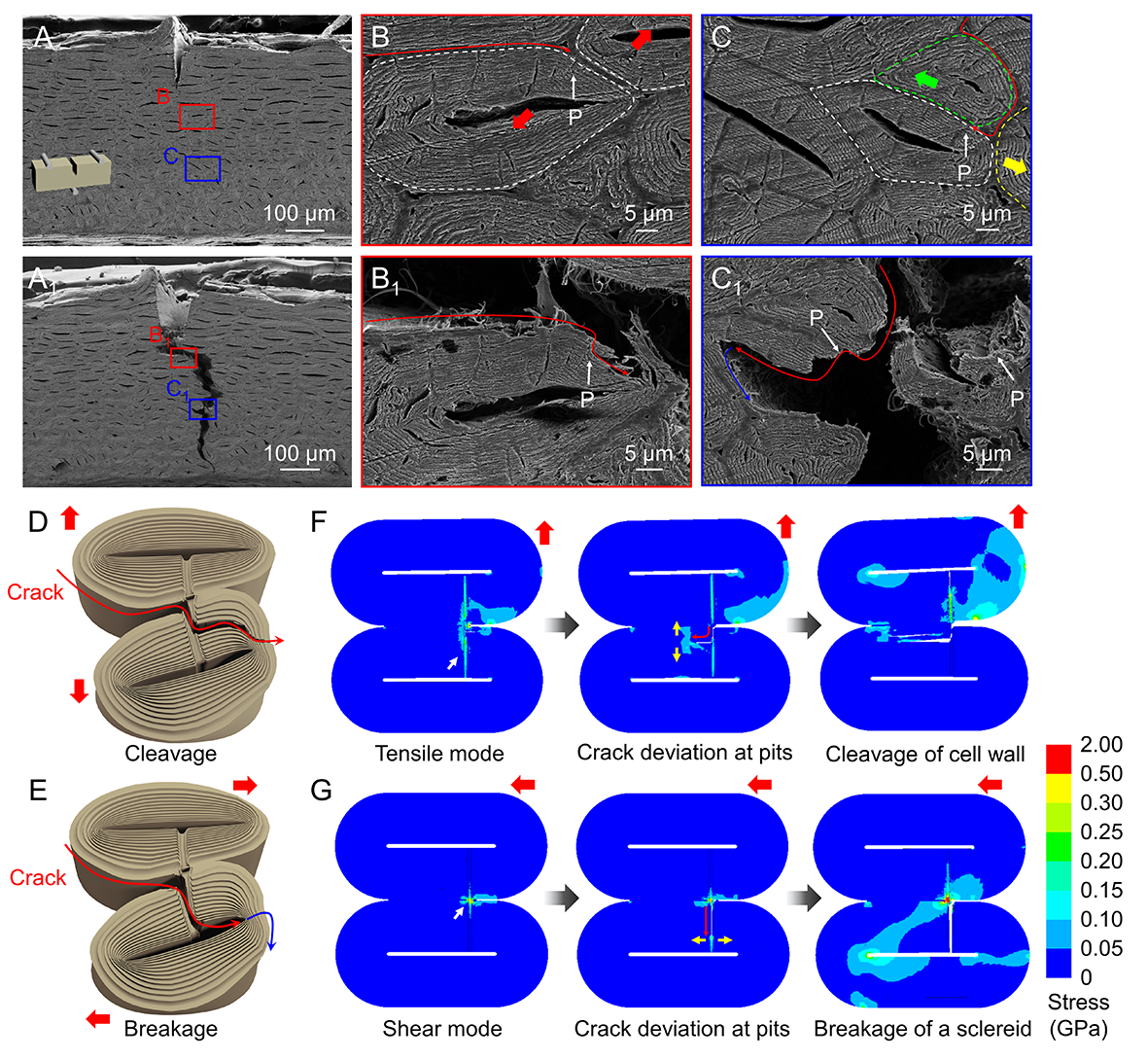 图 4. 裂纹扩展前(A)和扩展后(A1)的银杏果壳截面SEM照片;裂纹扩展前(B)和扩展后裂纹尖端(B1)的高倍SEM照片,显示了石细胞被撕裂的过程;裂纹扩展前(C)和扩展后裂纹尖端(C1)的高倍SEM照片,显示了石细胞被贯穿的过程。有限元仿真模拟的结果:(D和F)石细胞以展张开的模式分离,造成石细胞的撕裂;(E和G)石细胞以滑开的模式分离,造成石细胞的贯穿。