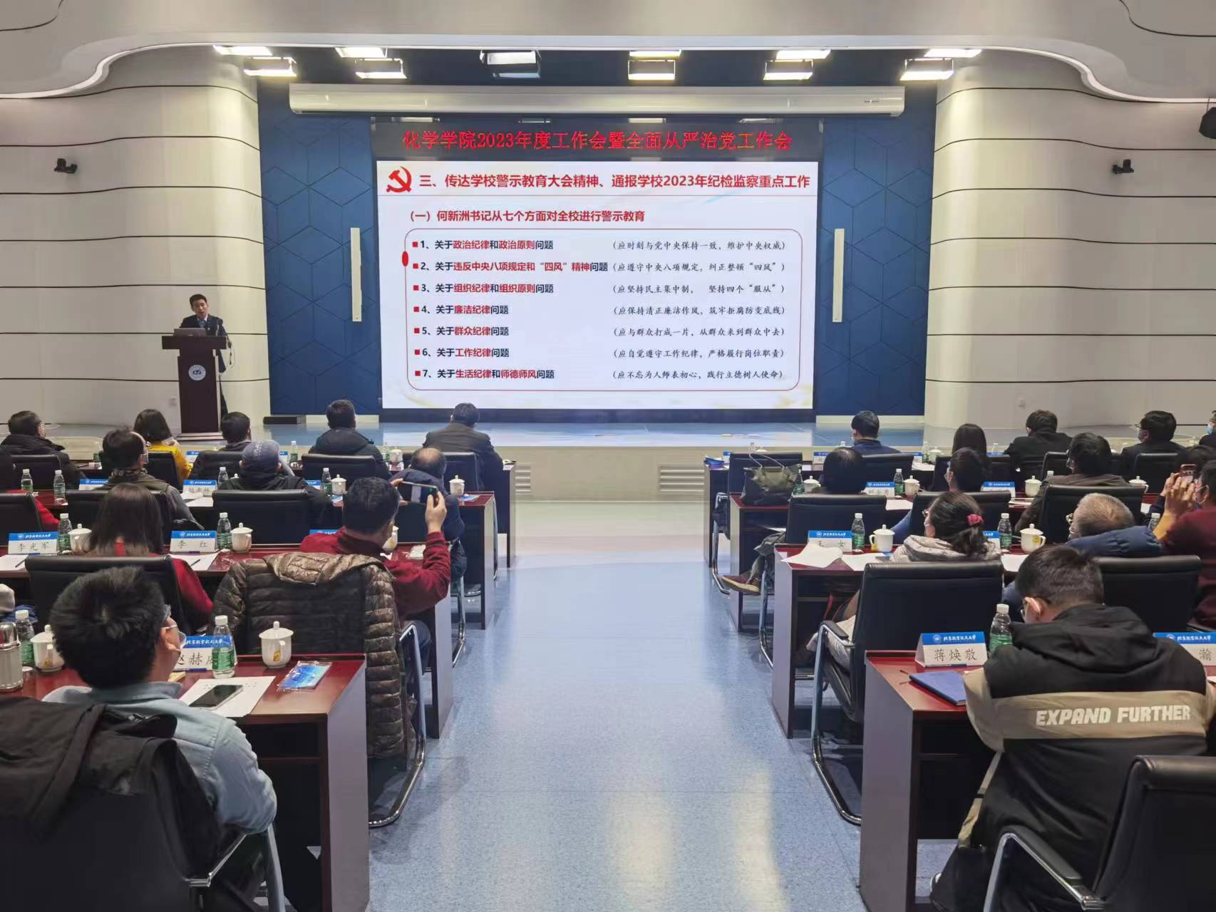 刘明杰院长强调,要把化学学科建设作为发展根基,优化专业布局。进一步保持仿生界面化学的国际引领地位,推动仿生轻质高强材料化学和仿生能源化学进入国际领先地位,推动学院学科、平台、团队一体化建设,统筹学院资源配置,高效推进原位化学反应表征平台和仿生界面与空天化学科教协同平台的建设。