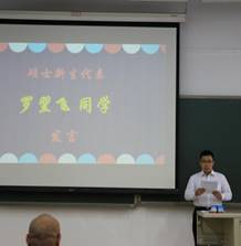 随后,在三位学生代表发言环节,2019级硕士新生代表罗翌飞同学总结了自己在本科期间做科研的体会。2019级博士新生代表陈江淳同学则告诉大家对于科研,不仅要有脚踏实地的态度,也要有敢为人先的胆识。而2017级博士李超同学作为在校生代表,则给出了科研路上的中肯建议:一定要把发现、解决问题的能力培养起来。