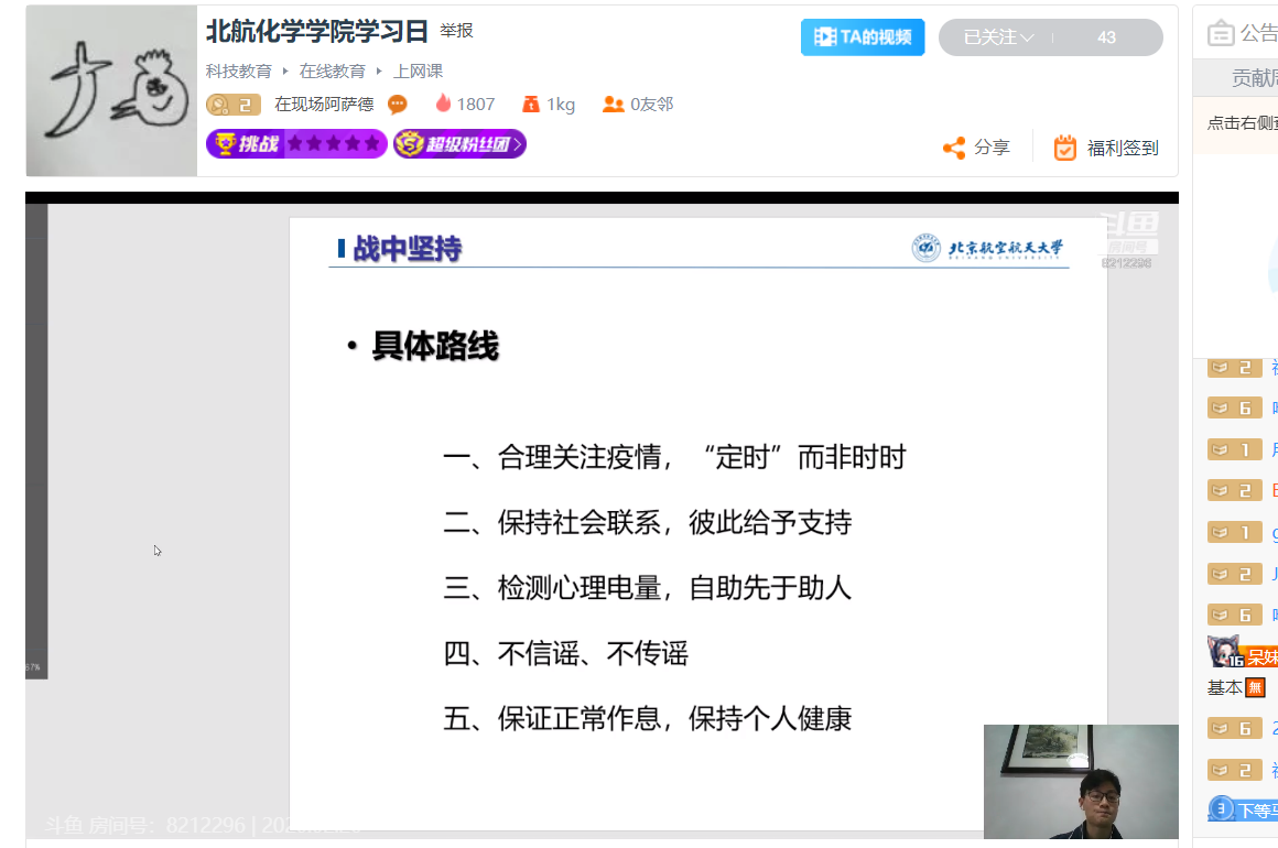 2月26日,365(VIP)英国上市公司全体本科生、研究生开展“学习日”活动,主要内容为首日教育以及疫情防控知识学习,通过线上直播讲解和视频播放方式进行。学习日活动由各年级辅导员主持。