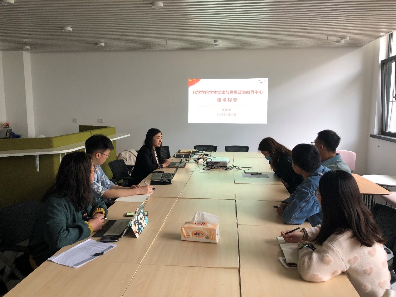 最后,分团委书记魏茜老师介绍了针对今年党史学习教育,学院成立学生党建与思想政治教育中心的建设构想,从“为啥建”“怎么建”“建什么”三个维度进行介绍,并动员学生支部书记积极参与,将党史学习教育成果转化为工作热情和动力,为学院党建工作贡献力量,以良好精神风貌庆祝中国共产党成立100周年。